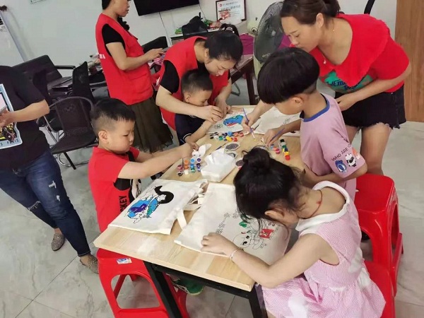 同时,志愿团队在活动现场向孩子们讲解保护大自然的重要性和垃圾分类的相关知识,组织参与活动的小朋友们手绘环保袋,用小小的画笔描绘环境保护和美丽的地球。通过这样的小活动倡导以环保袋代替一次性购物袋的绿色生活理念。