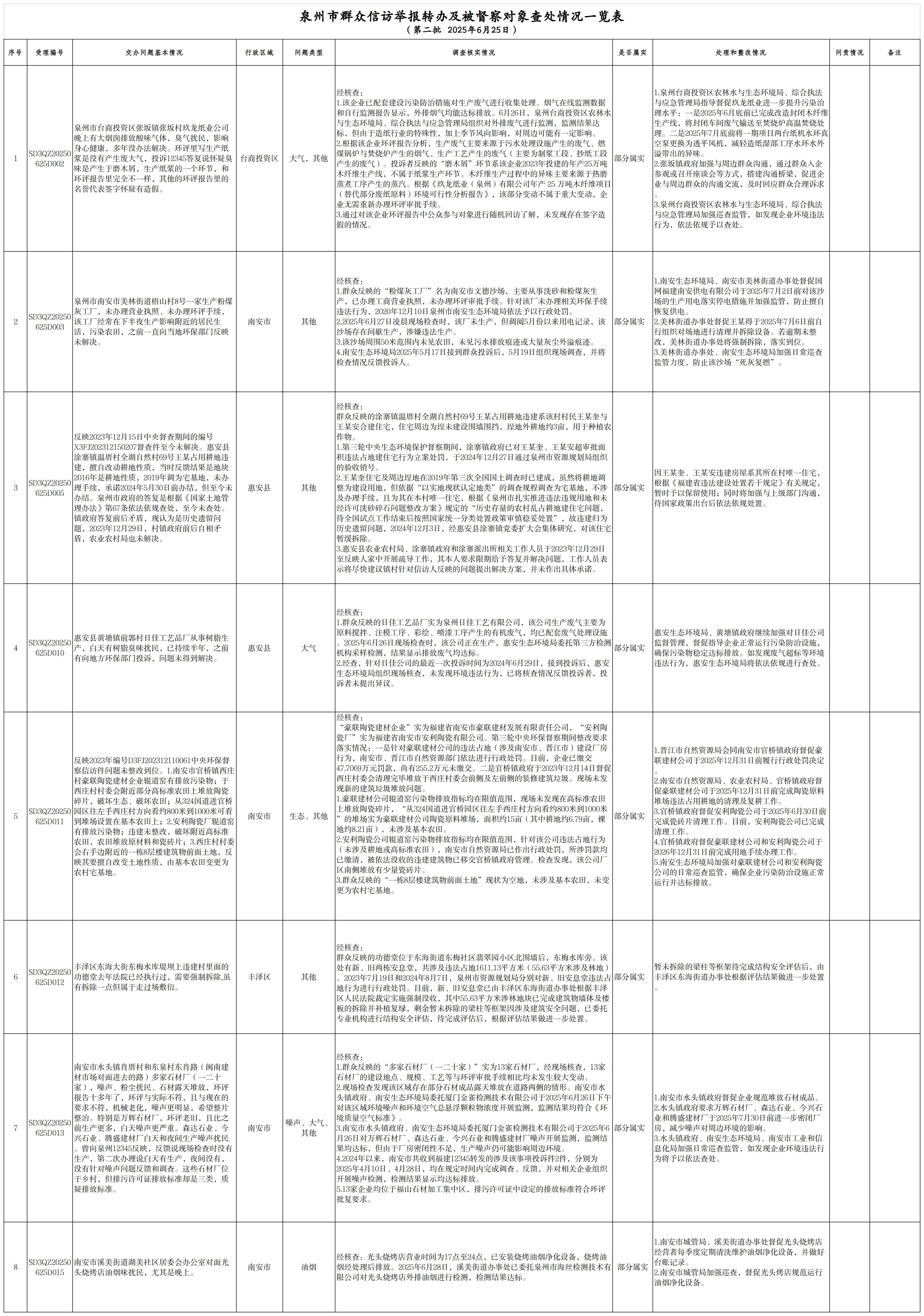 泉州市群众信访举报转办及被督察对象查处情况一览表(第二批)
